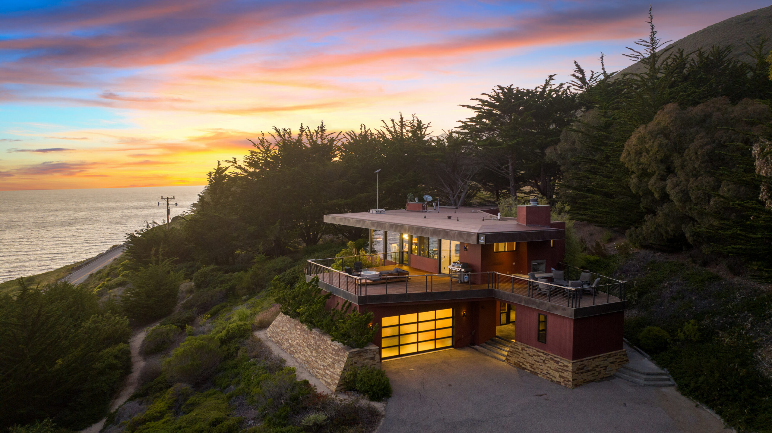 A modern architectural estate overlooking the Pacific Ocean.